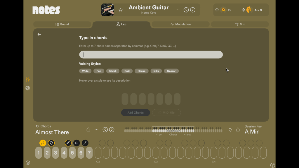 In Notes, all you have to do is go to The Lab and type in the chord progression. You can then try out different voicing styles like Wide, Pop, RnB, House and Dilla which can totally change the feel of the chords.
