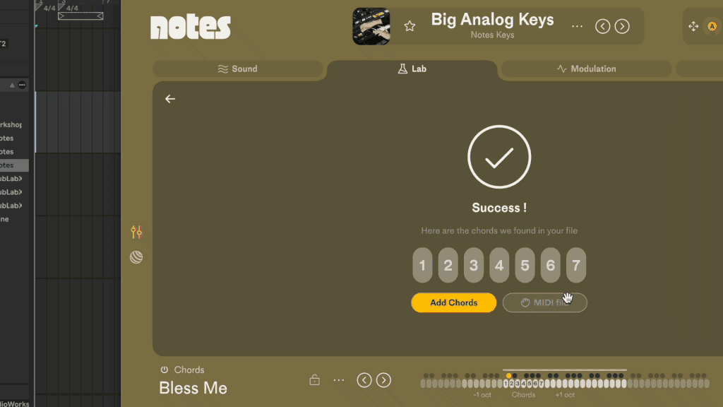 So why not try this: once you find a loop you like drop it into The Lab in Notes and it will detect the chords from your loop. You can switch up the chords with a totally different synth sound, play them in any key, and mix up the chords however you want.